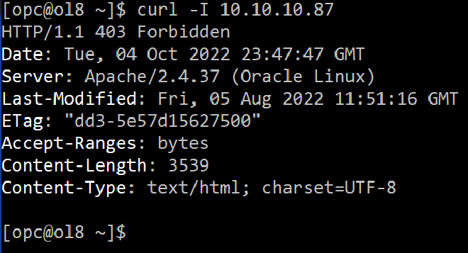It will try to fetch a page at the Root of the web server, which should return an HTTP/200 code to be marked as healthy. You can see the test page, but it makes no sense. That’s where the tricky part is: if you inspect the response of the web server, you will see that despite showing the test page and it looks like a simple page; the return code is HTTP/403, as you can see below: